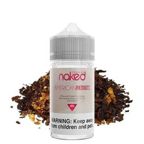 Naked vape juice flavor American Patriots vape juice has a base of 65 percent vegetable glycerin (VG) and 35 percent polypropylene glycol (PG), offering vapers a nice throat hit and a smooth, refreshing taste. Give Naked 100 American Patriots e-juice a whirl to satisfy your tobacco flavor cravings.