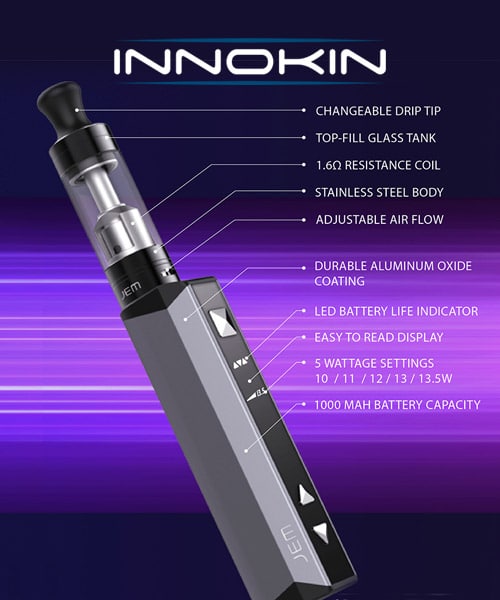 Innokin JEM Goby Kit is the compact and stylish Vape kit that features the super-easy adjustable 5 Level Wattage. It is the Superior Mouth-to-Lung starter kit with the internal 1000mah rechargeable battery.