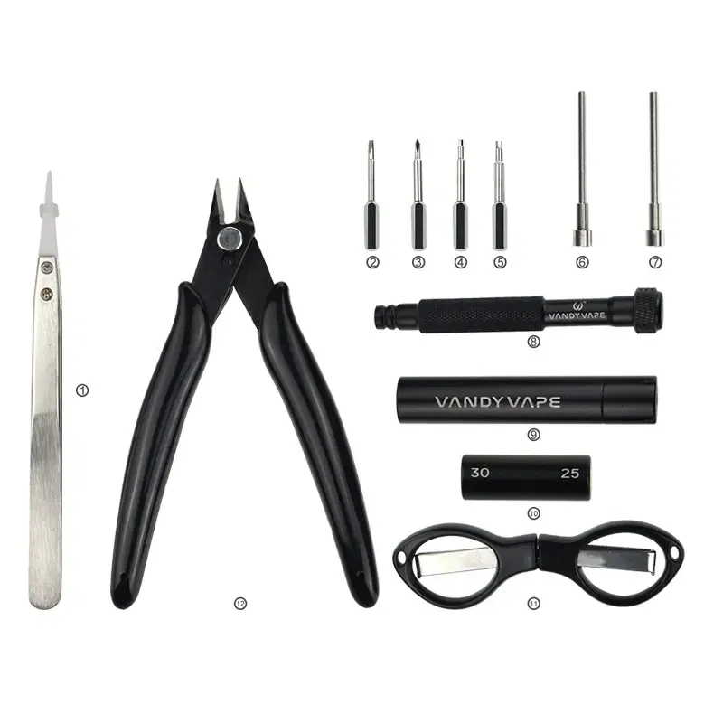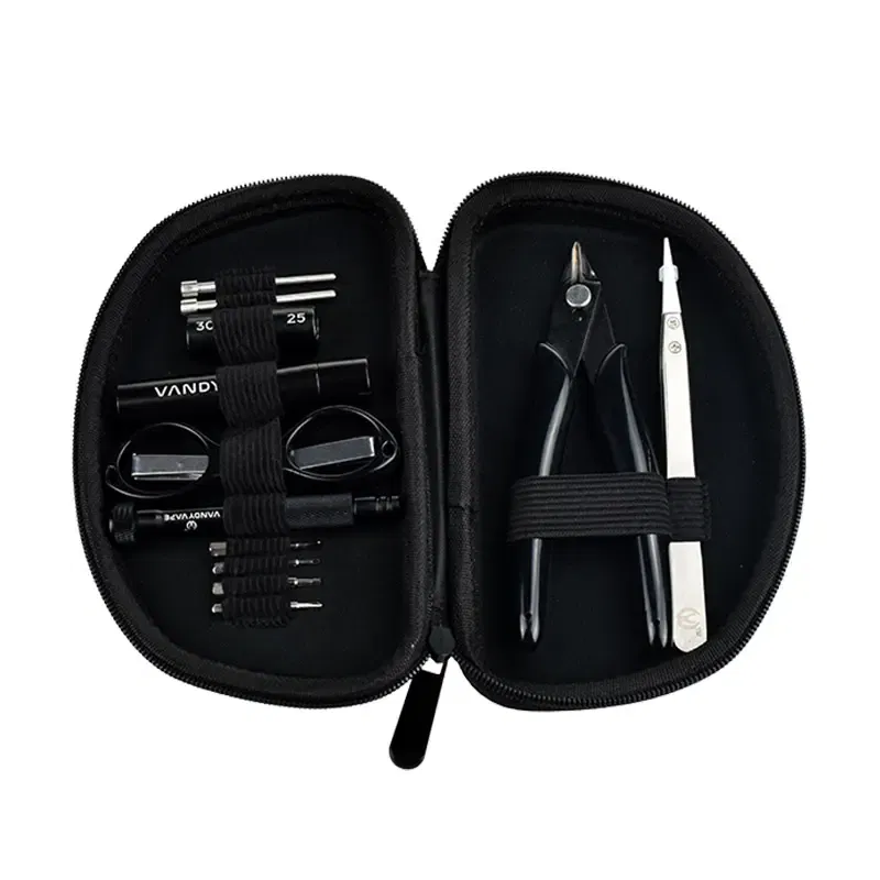 Vandy Vape DIY Simple Tool Kit Pro. A compact and affords set of essential tools in a durable zippered carrying case. It includes one Ceramic tweezer, three screwdrivers, two Inner- hexagon screws, four Coil Kits, and Scissors and Pliers.